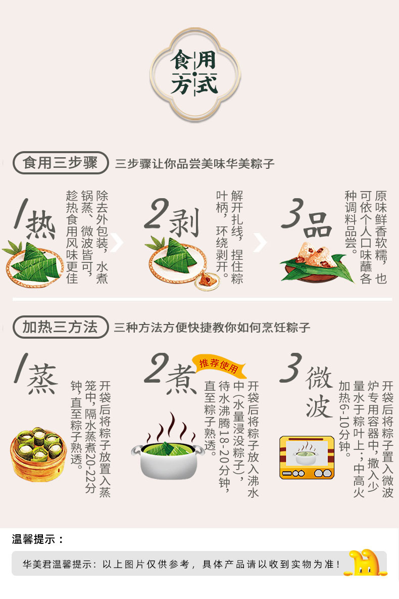 品牌名称:huamel/华美 厂名:浙江粮午斋食品有限公司 保质期:180 天 净含量:610g 馅料:鲜肉粽