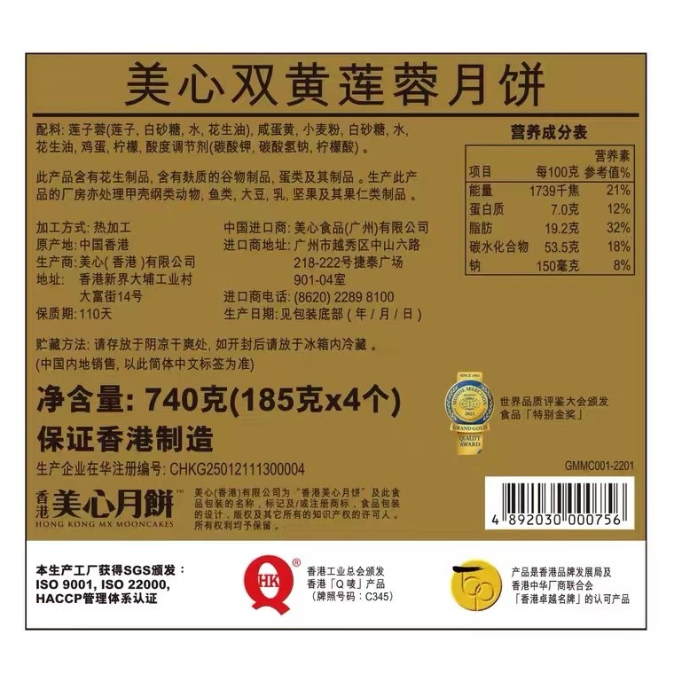 原产地:中国香港 保质期:110天 净含量:740g 生产商:美心(香港)有限公司