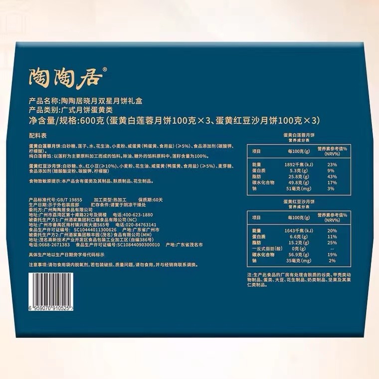 产品名称:陶陶居晓月双星月饼礼盒 保质期:60天 净含量:600g